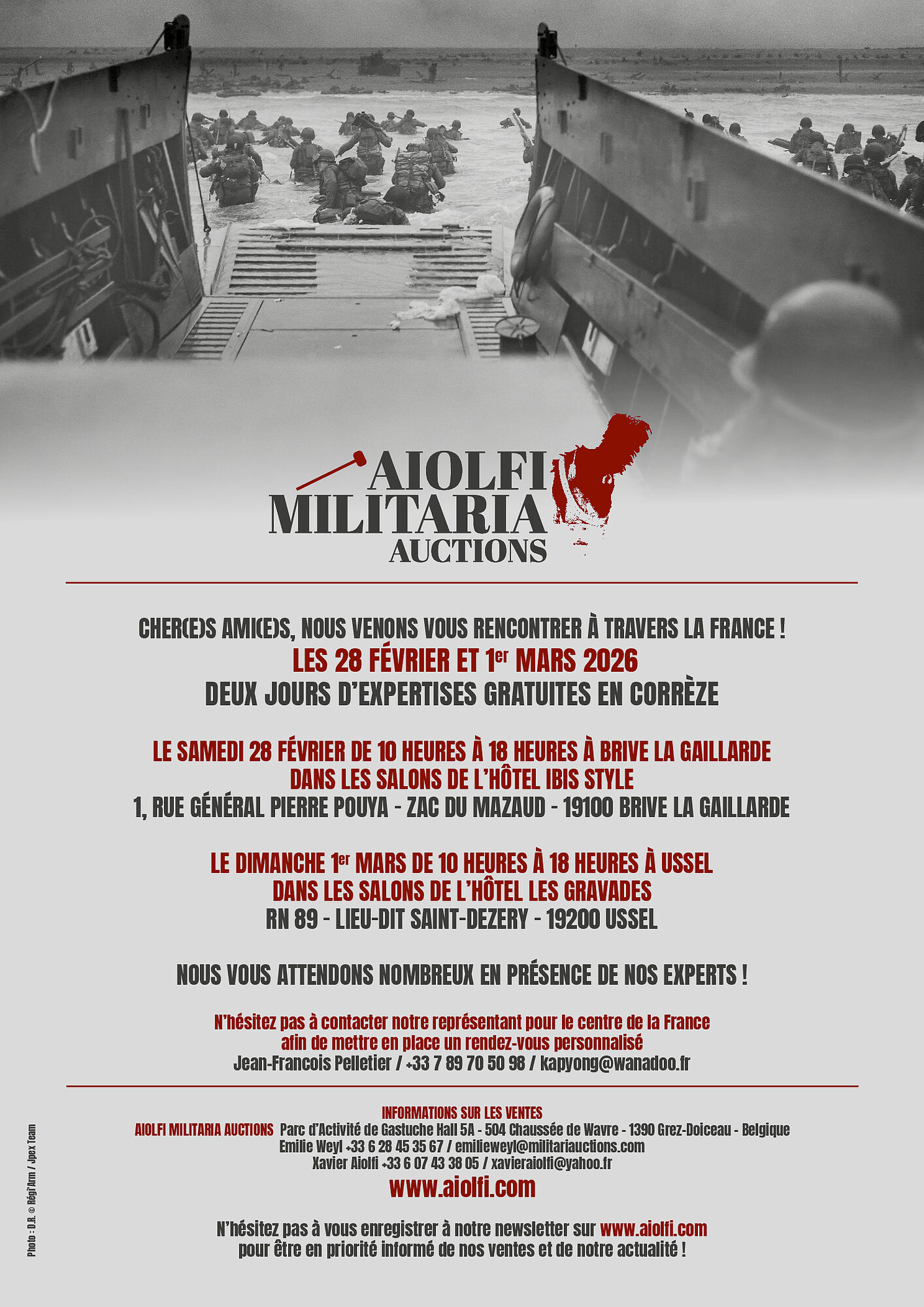 We are preparing a year rich in sales and full of surprises, and we are already pleased to announce that our first sales session will take place on April 16, 17, 18, and 19 with our partner Militaria Auctions in Grez-Doiceau.