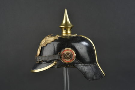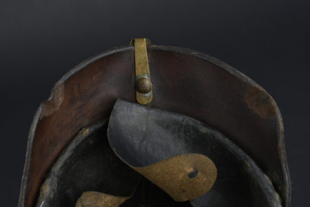 Bombe en cuir, légèrement craquelée. Plaque badoise d origine. Bonnes cocardes. Pointe non dévissable. Jugulaire fortement abîmée. Intérieur présent et complet, cordon de serrage manquant.... en savoir plus