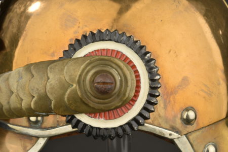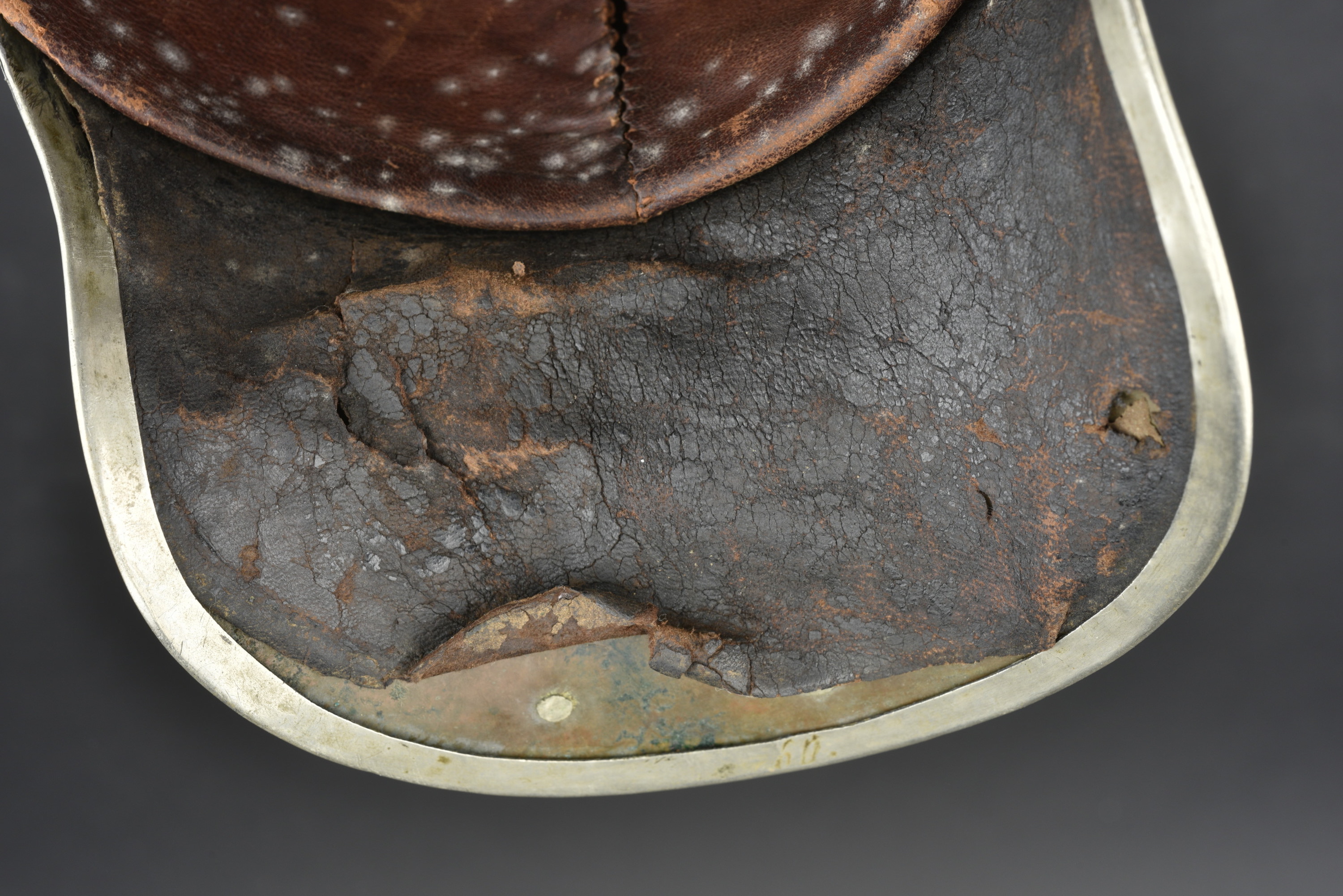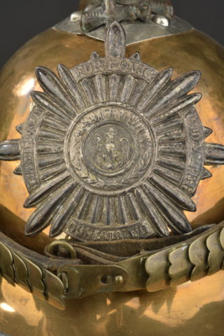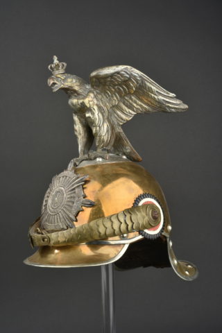 Bombe en tombac (avec de nombreux perçages). Remontage d’une plaque, d’un aigle, d’une coiffe, et de cocardes postérieures. Très belle et fidèle reconstitution d’une coiffure mythique... en savoir plus