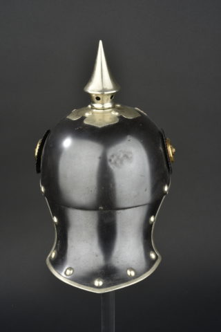 Régiments 1 à 7. Intérieur, jugulaires, plaque, postérieures. Bombe en bon état, du fabricant C.E. JUNCKER daté de 1914. Pièce intéressante à compléter.