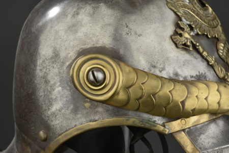 Complet de ses jugulaires et cocarde (peinture en grande partie absente). Bonne plaque au modèle (petites réparations). Traces de corrosion sur la bombe (petit manque de métal sur la nuquière)... en savoir plus