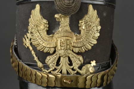 Corps en cuir fin recouvert de drap (quelques trous d’insectes). Belle plaque en laiton dorée au modèle fixée par des pattes rabattables jamais ouvertes. Intérieur avec une basane déchirée. Et satinette décousue Complet de ses attributs, cocardes, jugulaires et feldzeichen.