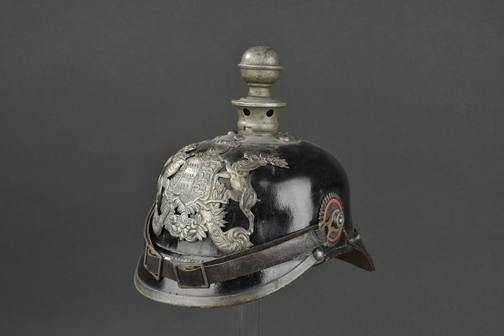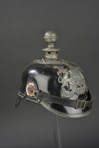 Bombe en cuir, garnitures fer, boule amovible. Cocardes et jugulaires postérieures. Taille 57, daté de 1915 Bon état général