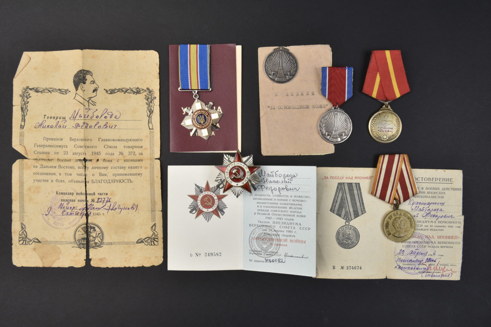 Ensemble comprenant médaille pour la Victoire sur le Japon avec document, Médaille pour la libération de la Corée avec document