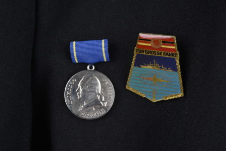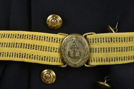 Vareuse en tissu noir, grades de col brodés en fil doré, grade de Contre amiral de la flotte russe, cinq décorations pendantes. Tous les boutons sont présents et datés 1975. Pantalon en tissu... en savoir plus