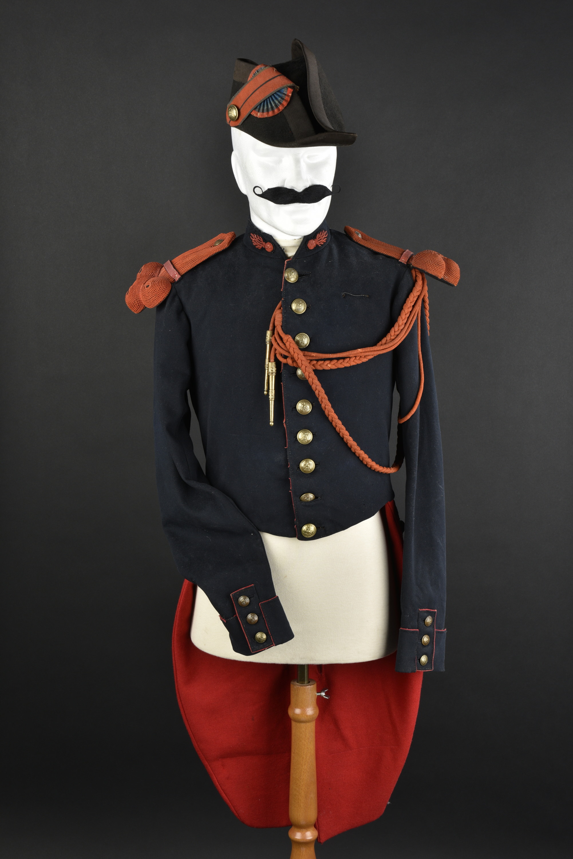 comportant un bicorne de troupe de l’unité fabrication Moreteau Frères à Lyon, un habit à basques, une paire de trèfles boules rouge et ses aiguillettes à ferrets doré. Traces de trous de... en savoir plus