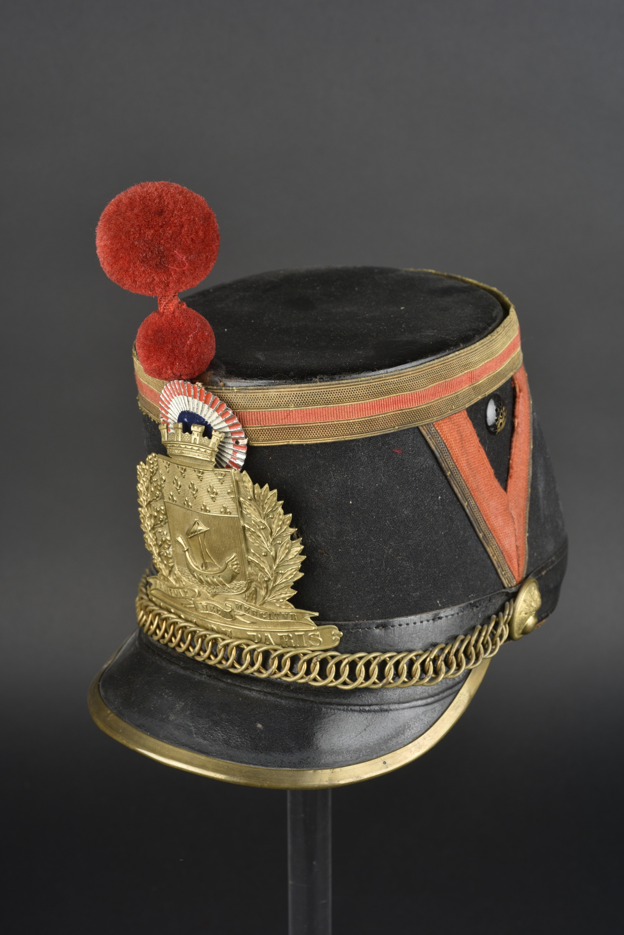 avec sa plaque et son double pompon, cuir intérieur usée et comportant des manques, réparation postérieures dans l’intérieure de la coiffe.