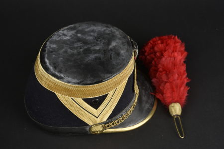 complet avec son plumet d’officier en plume de vautour, sa jugulaire cuir, fabriqué par J. Barrau à Paris et marqué « HS » pour Hors Service indiquant que la pièce a été réformée. Coiffure présentée dans sa boite de transport en bois réglementaire.