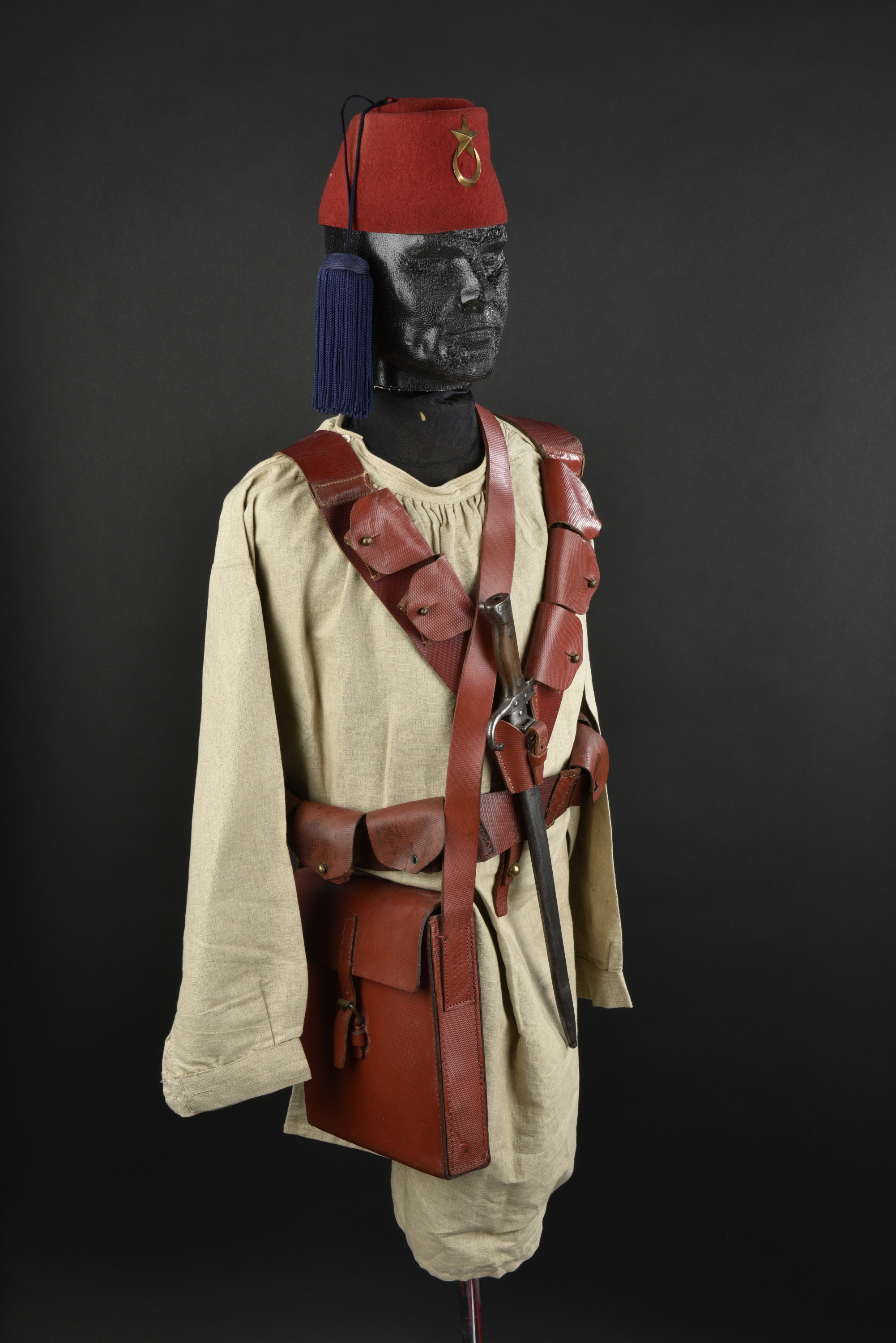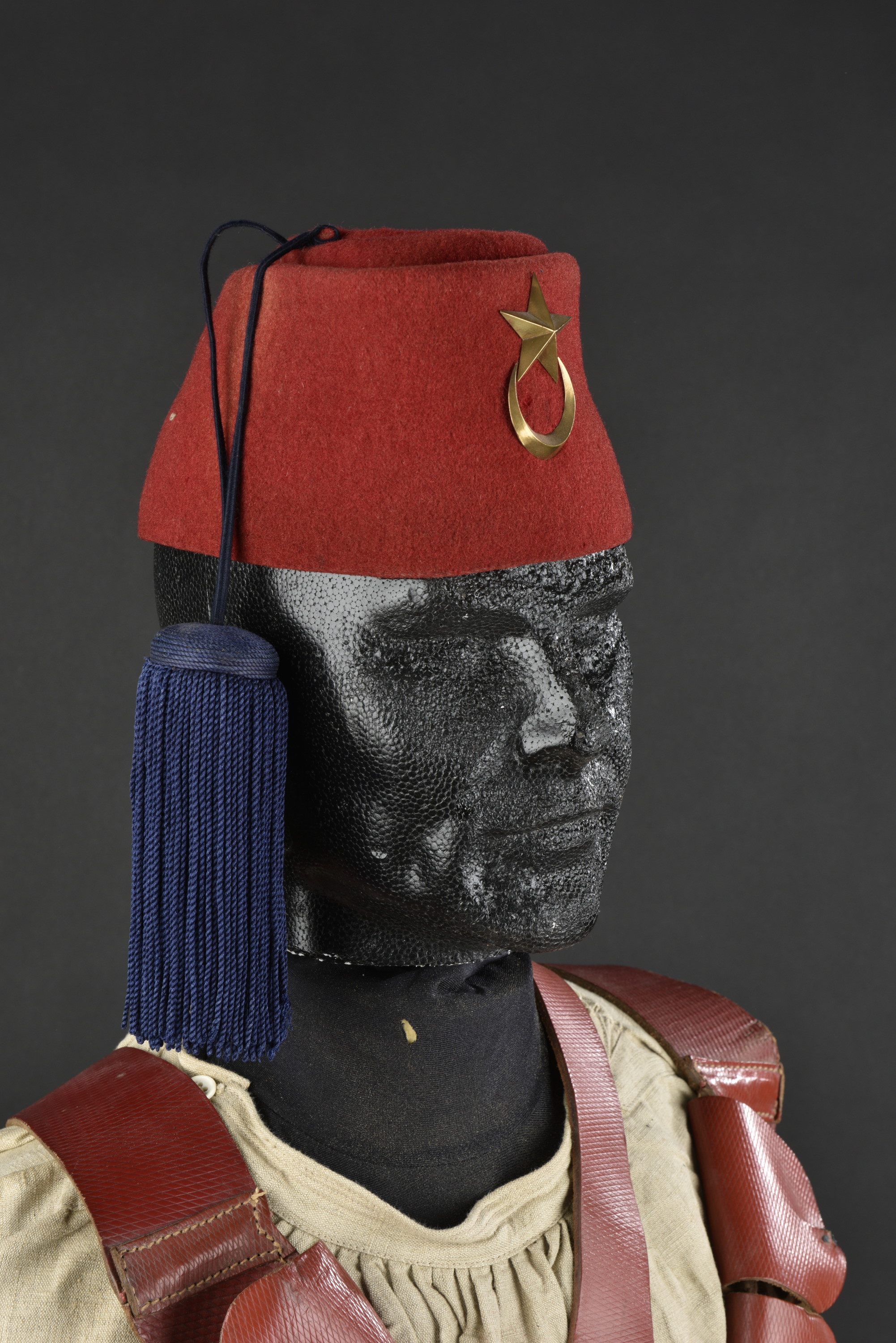 comportant une chéchia rouge avec son pompon et l’insigne métallique de Garde Cercle figurant l’étoile et le croissant, une gandoura en toile beige, ensemble ceinturon cartouchière et... en savoir plus
