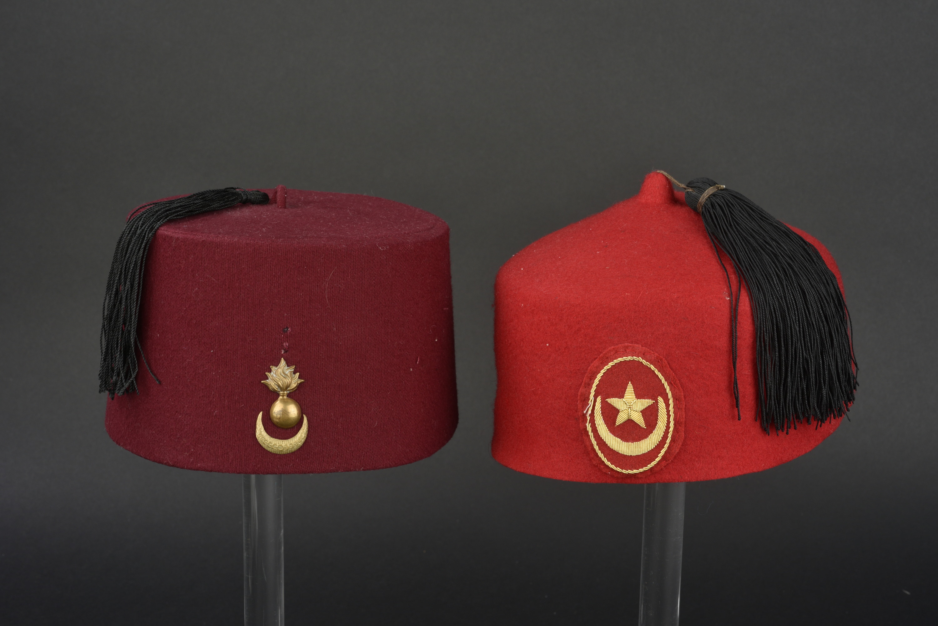 comprenant un fez porté au Maroc avec attribut métallique, et une calotte avec croissant et étoile brodées.
