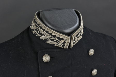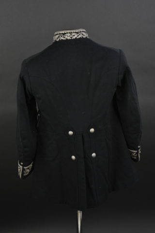 Troisième République, tous les boutons sont présents sur double rangée. Très belles broderies au col et aux manches en cannetille argent. Intérieur doublé en satinette noire, étiquette du... en savoir plus