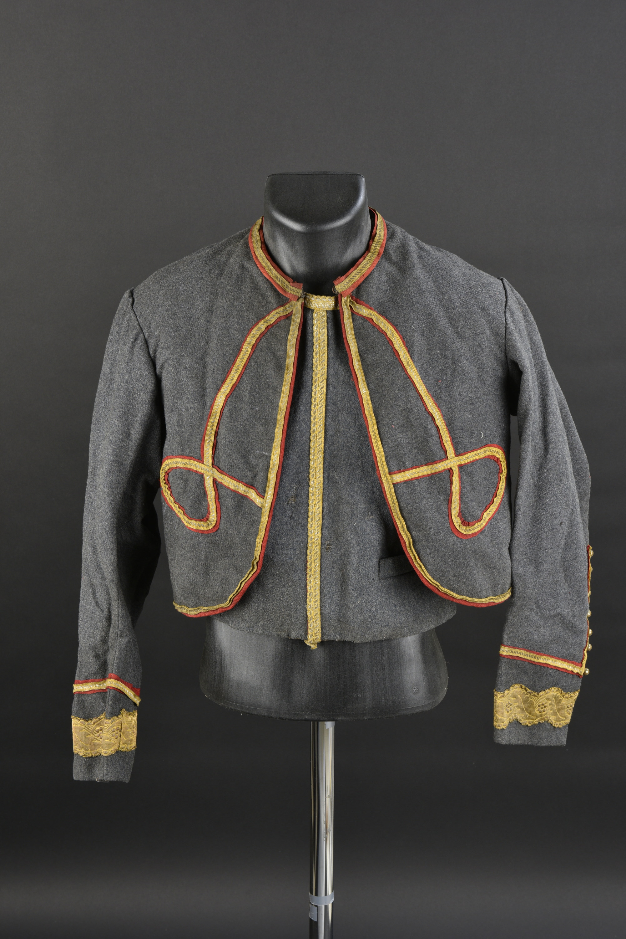 Veste, gilet et pantalon et drap gris bleuté, fabrication française de 1870 (Nantes ou Angers), avec tresses et galons modifiés par un costumier. A noter une certaine patine des pièces.
