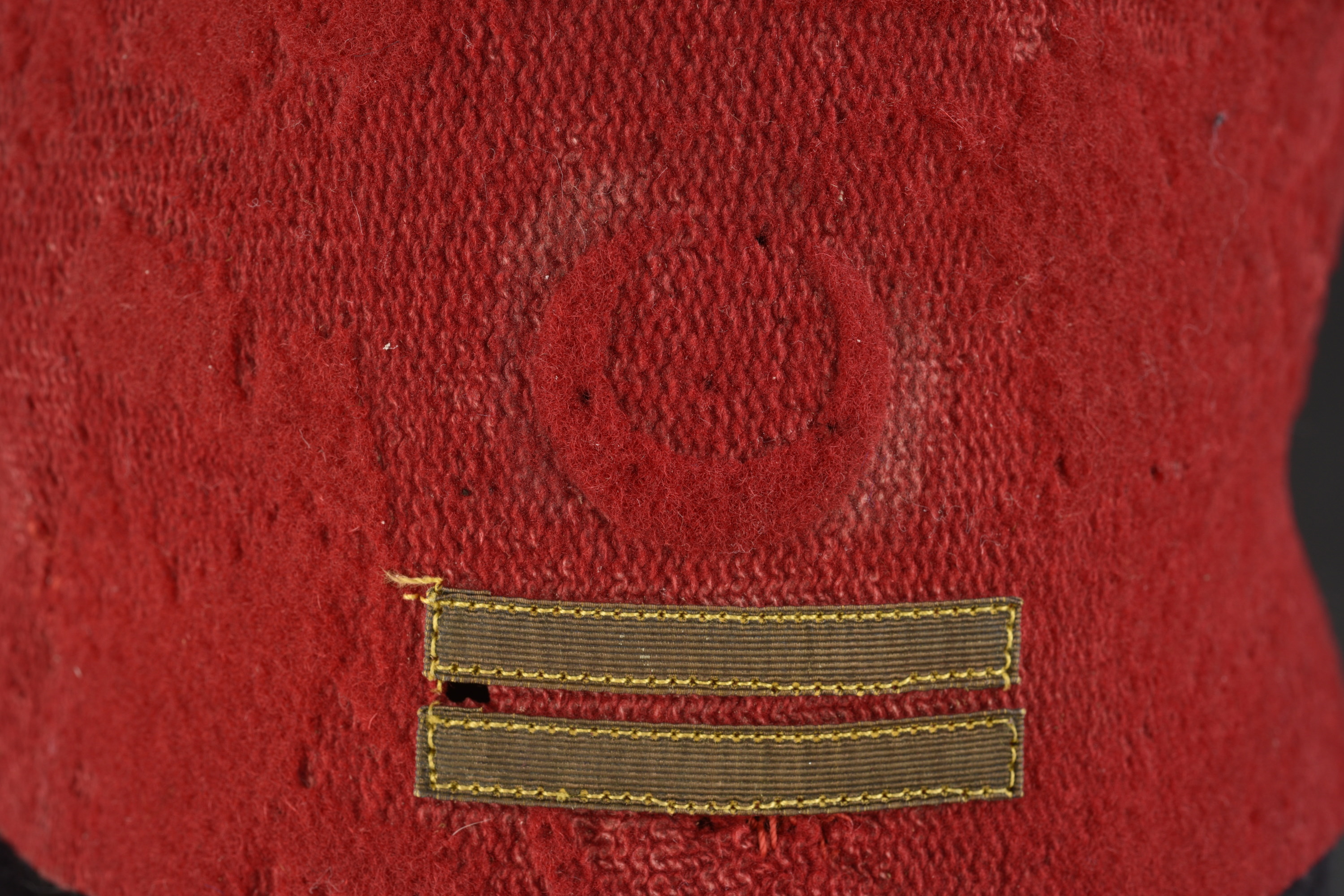 En drap rouge. Double galon doré de Lieutenant, trace d’un croissant. Pièce fortement usé et mitée.