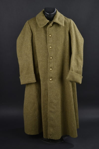 Capote d’officier à rangée de 6 boutons, grades brodés au bas des manches, rappel de décoration ( Légion d’Honneur et Croix de Guerre), insignes de cols décousus.