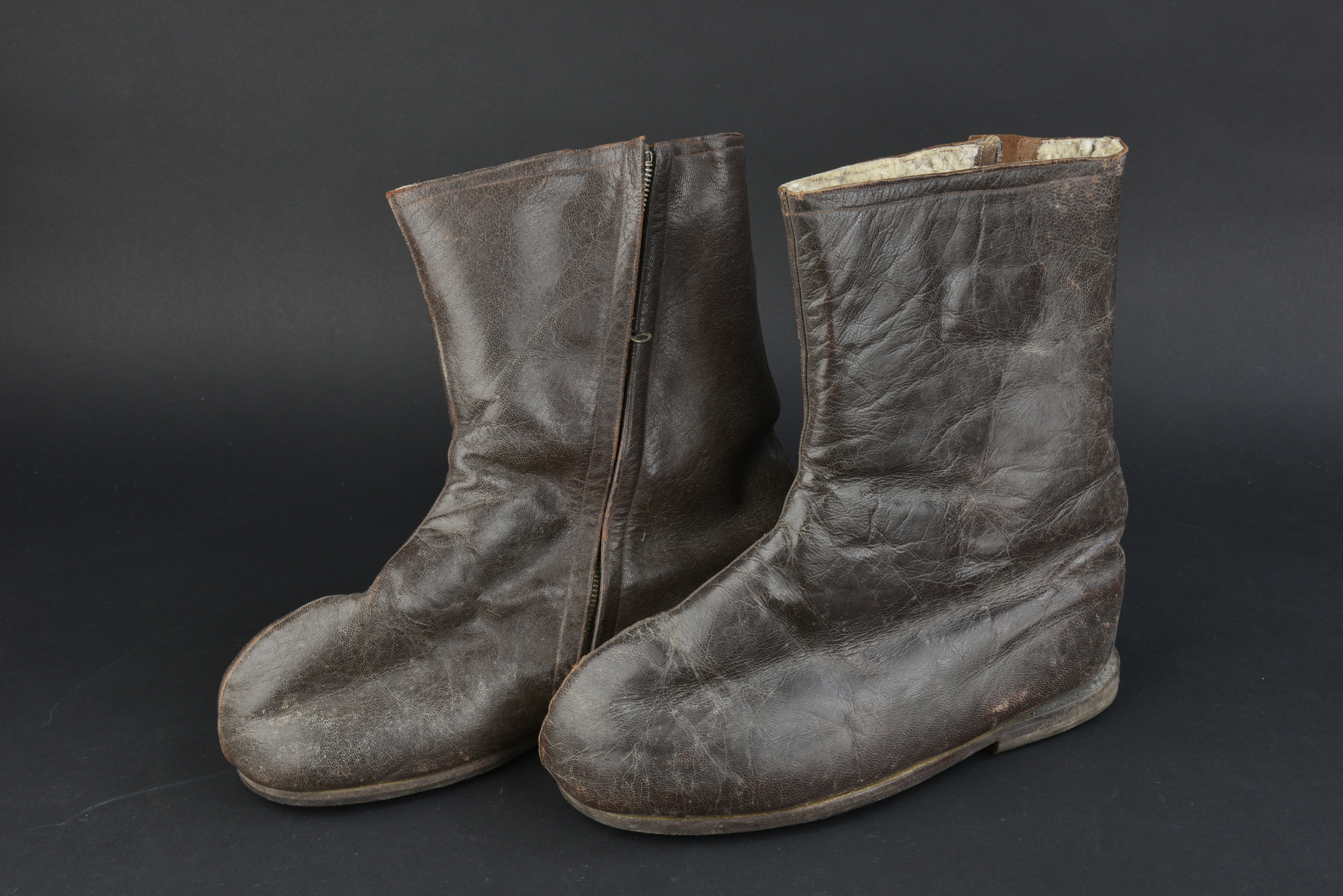 très bon état, taille 44, daté 1940, doublure mouton, fermeture Eclair fonctionnelles, probablement ressemelées.