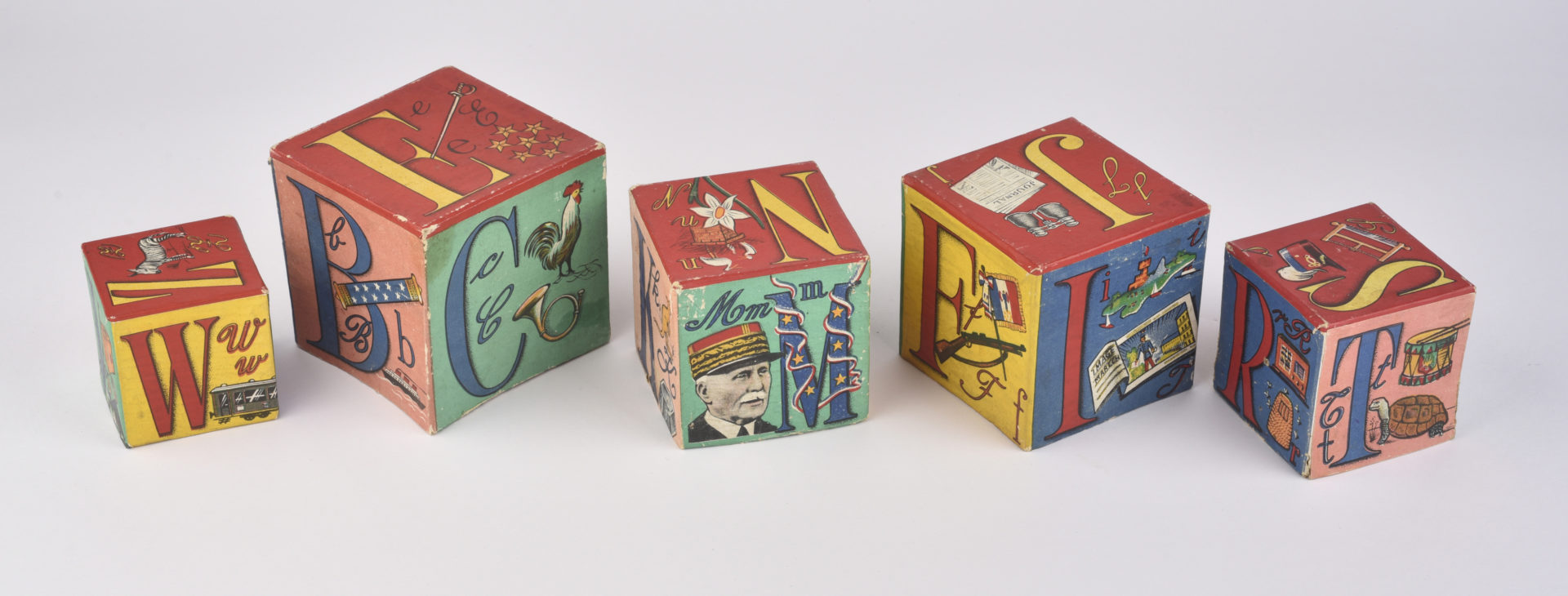 Composé de cinq cubes en carton fort et emboités les uns dans les autres. Les côtés sont marqués d’une lettre avec dessin explicatifs. Jeu ludique mais aussi instructif bien dans l’esprit de l’époque.