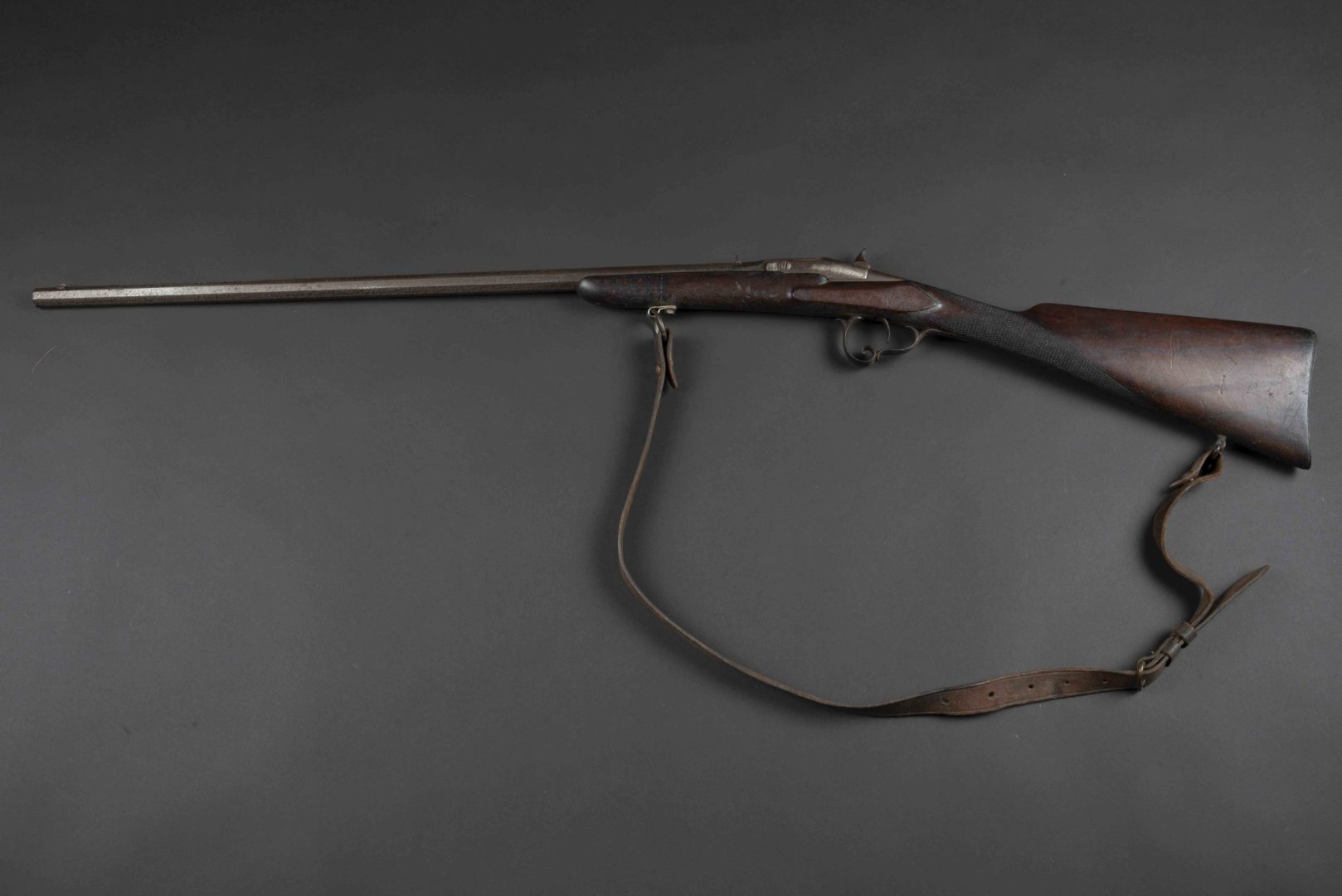 Crosse en bois présentant quelques marques d’usures et à-coups. Bretelle en cuir présente. Mono coup. Canon octogonal. Aucuns marquages. Pièce fortement oxydée. Diamètre en sortie de bouche 9 mm. Provenant des anciens stocks de l’armurerie Angot fermée en 1991. Le fonctionnement de l’arme n’est pas garanti.