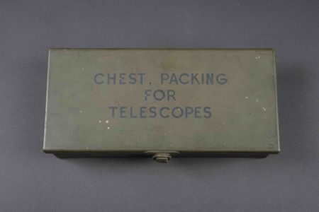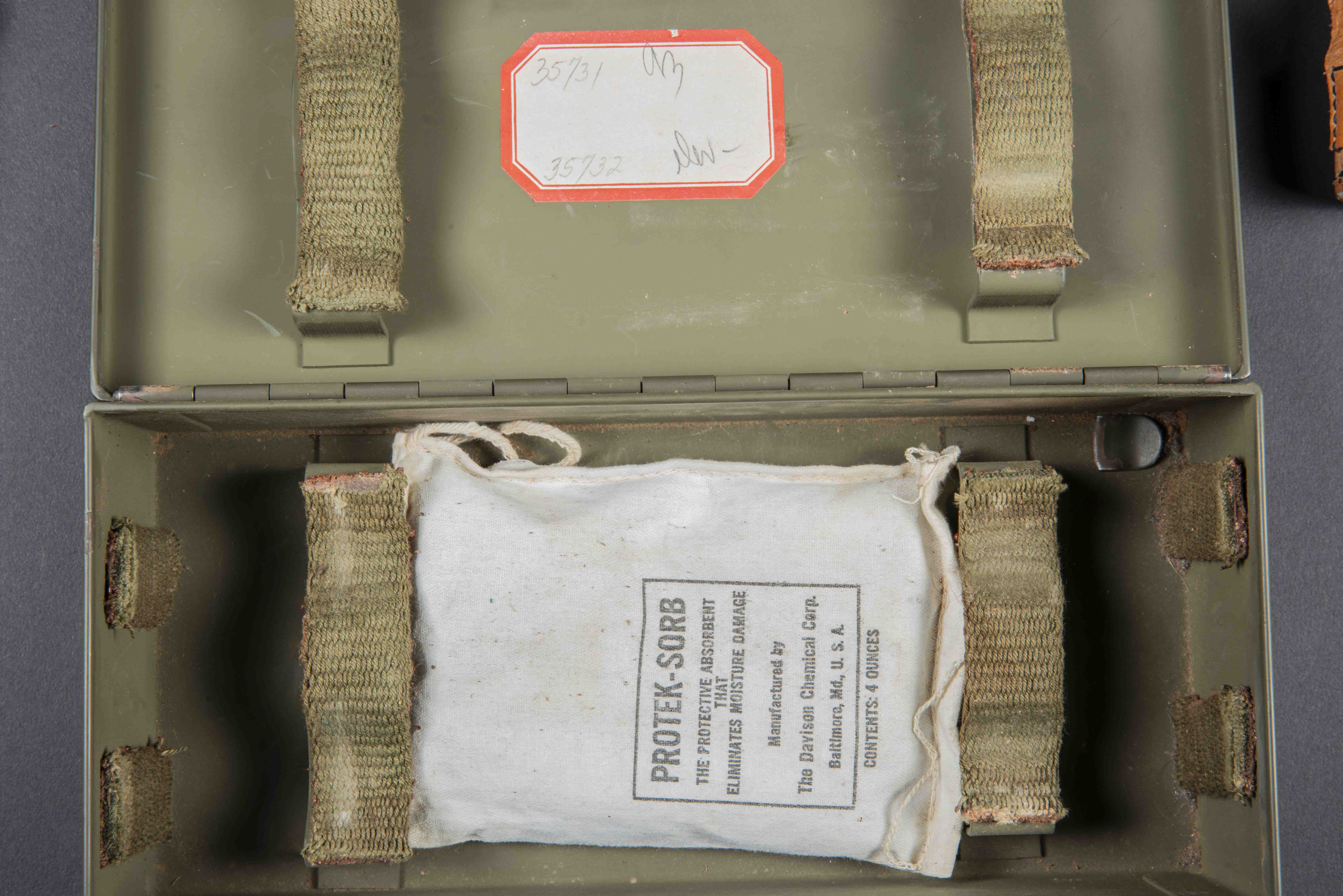 Boite en métal, peinture kaki à 90%. Marquages sur le couvercle Chest Packing for Telescopes. Contenant deux lunettes bien marquées Telescope M-7, optiques parfaites. Protections en cuir... en savoir plus