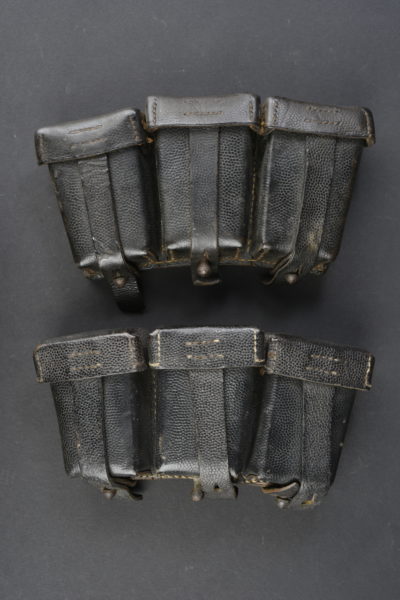 En cuir noir grenelé. Attaches métalliques. Complètes. Fabrication LAOT et GFG 1942. Paire non homogène. A noter une certaine patine des pièces.