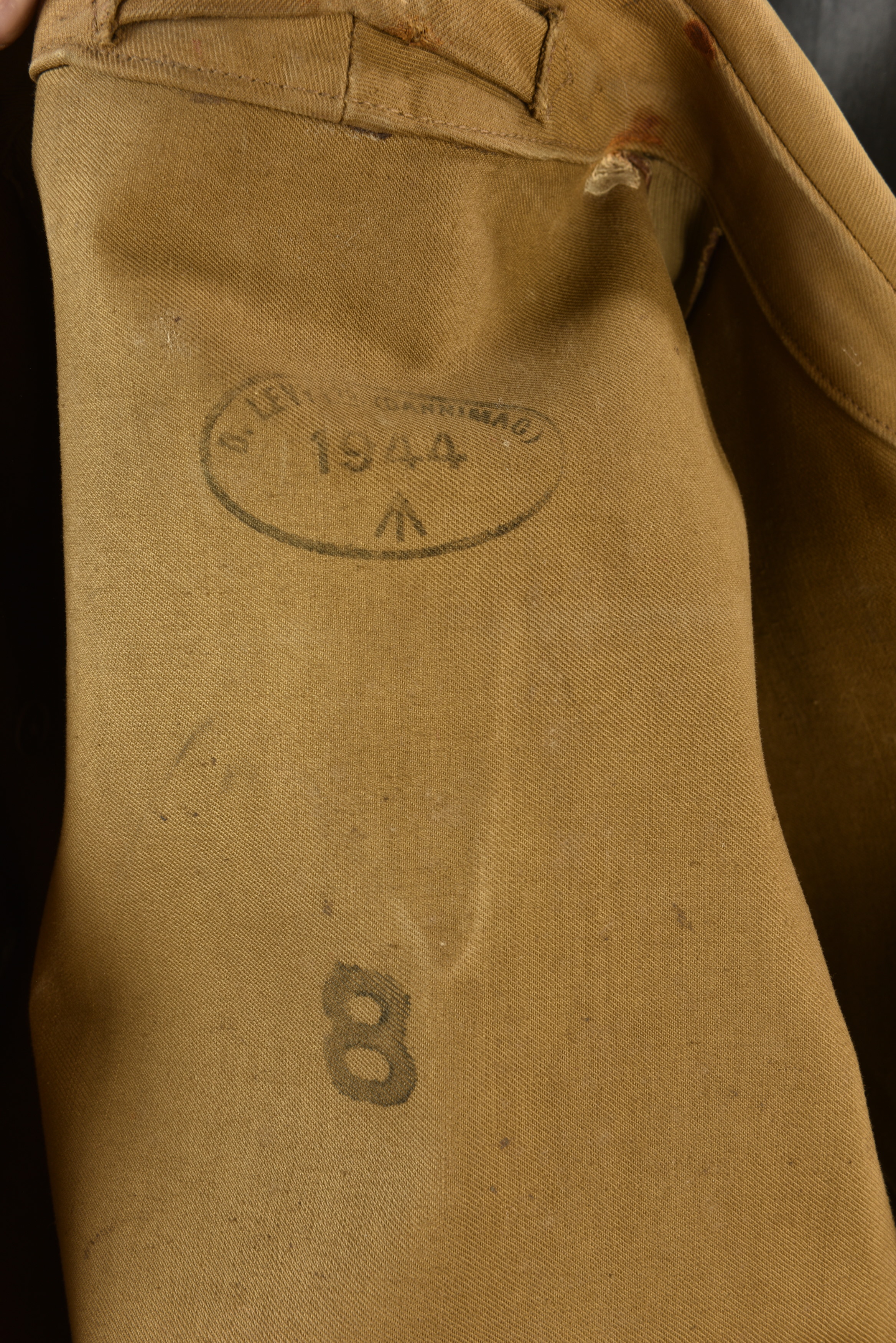 En forte toile caoutchouté de couleur cachou. Tous les boutons sont présents. Marquages au tampon dans le col, nom du fabricant illisible. Daté 1944, taille 8. La ceinture est présente. A... en savoir plus