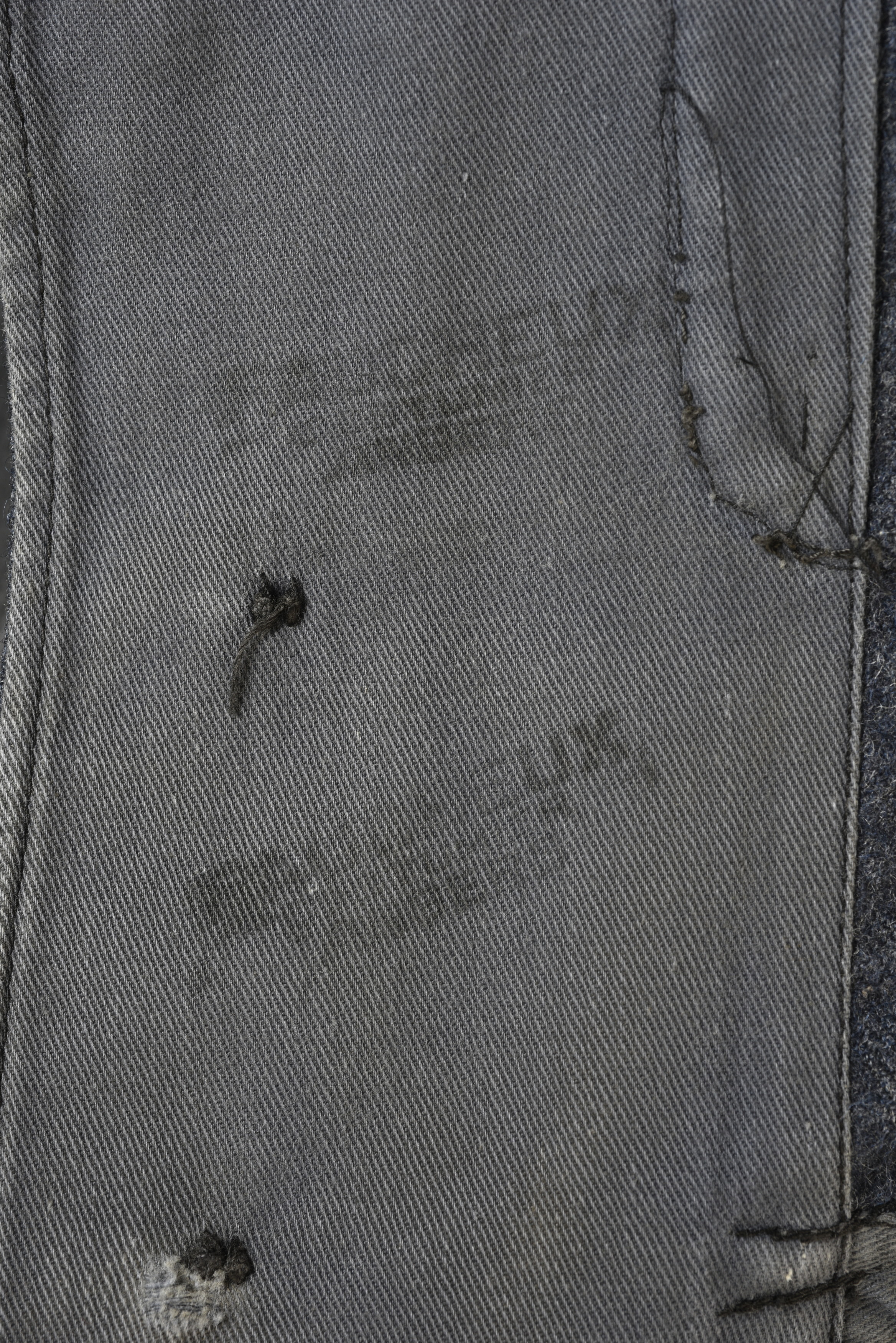 En laine de serge bleue. Tous les boutons sont présents. Aucuns insignes. Ceinture manquante. Nombreuses réparations et marques d’usures. Nombreux marquages illisibles au niveau de la... en savoir plus
