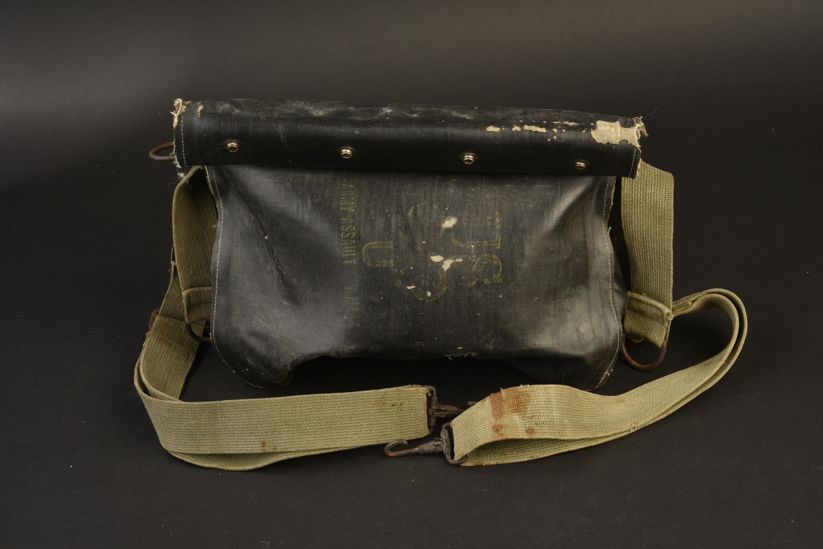 Housse en toile caoutchouté noire. Masque en caoutchouc noir daté 1944, filtre présent. A noter une certaine usure et oxydation de la pièce.