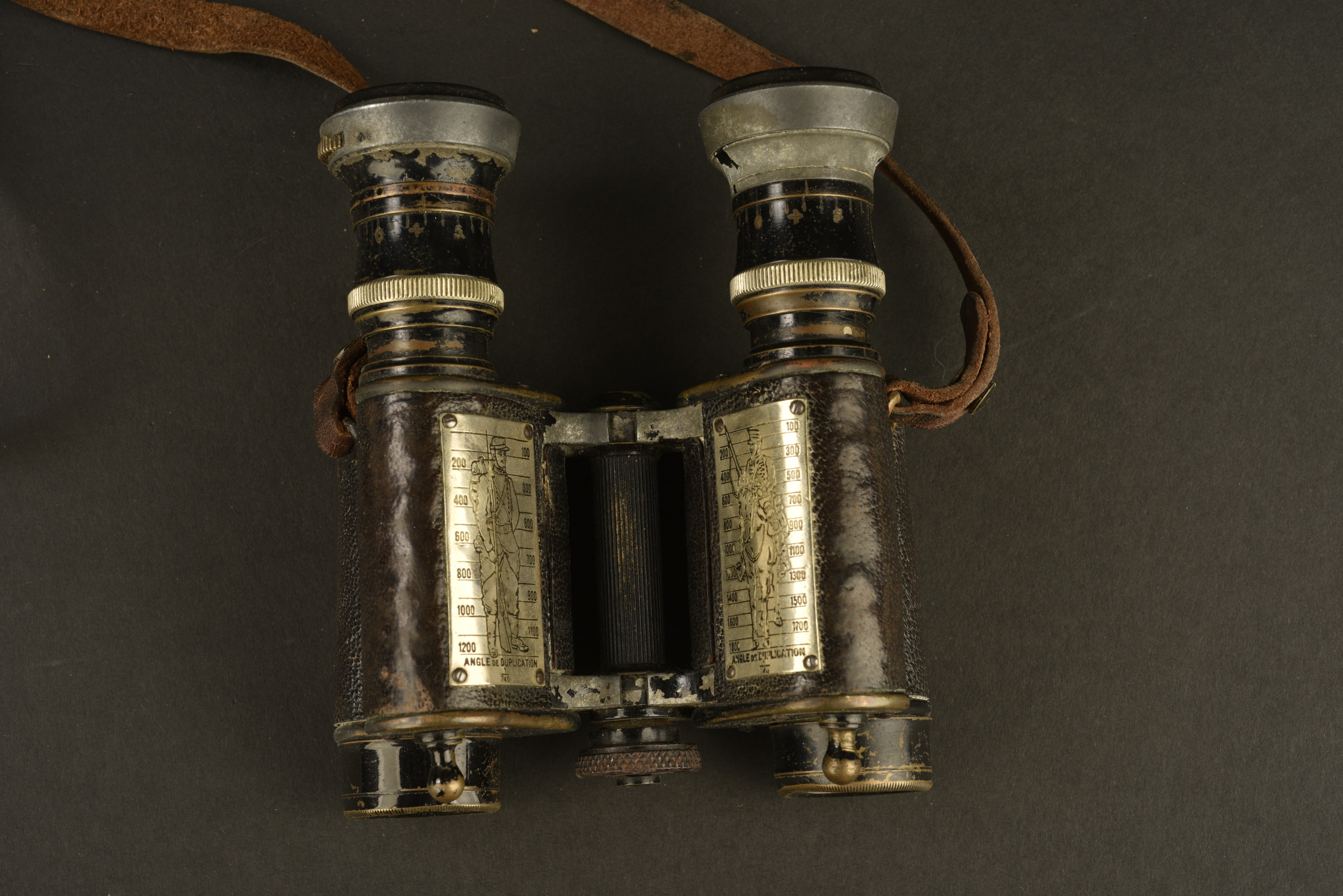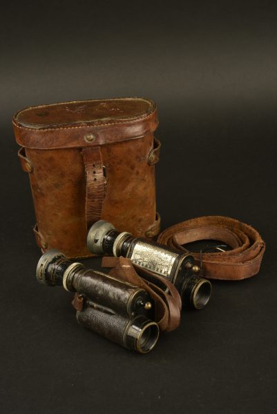 Jumelles française avec plaquettes représentant des soldats. Optiques claires. Courroie de transport présentes. Housse en cuir marron avec sa sangle de transport, sans marquages visibles. A... en savoir plus