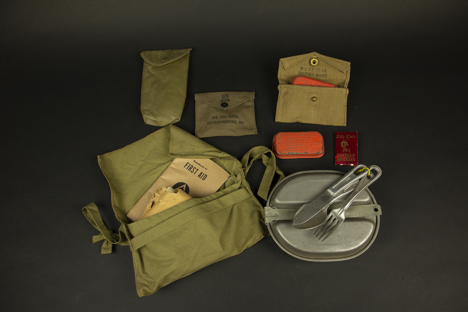 Comprenant une gamelle complète datée 1944. Une pochette Kit Gaz Mask M1, un pansement dans sa boite en métal rouge. Une grande cuillère, une fourchette et un couteau marqué L&F 1944. Un... en savoir plus