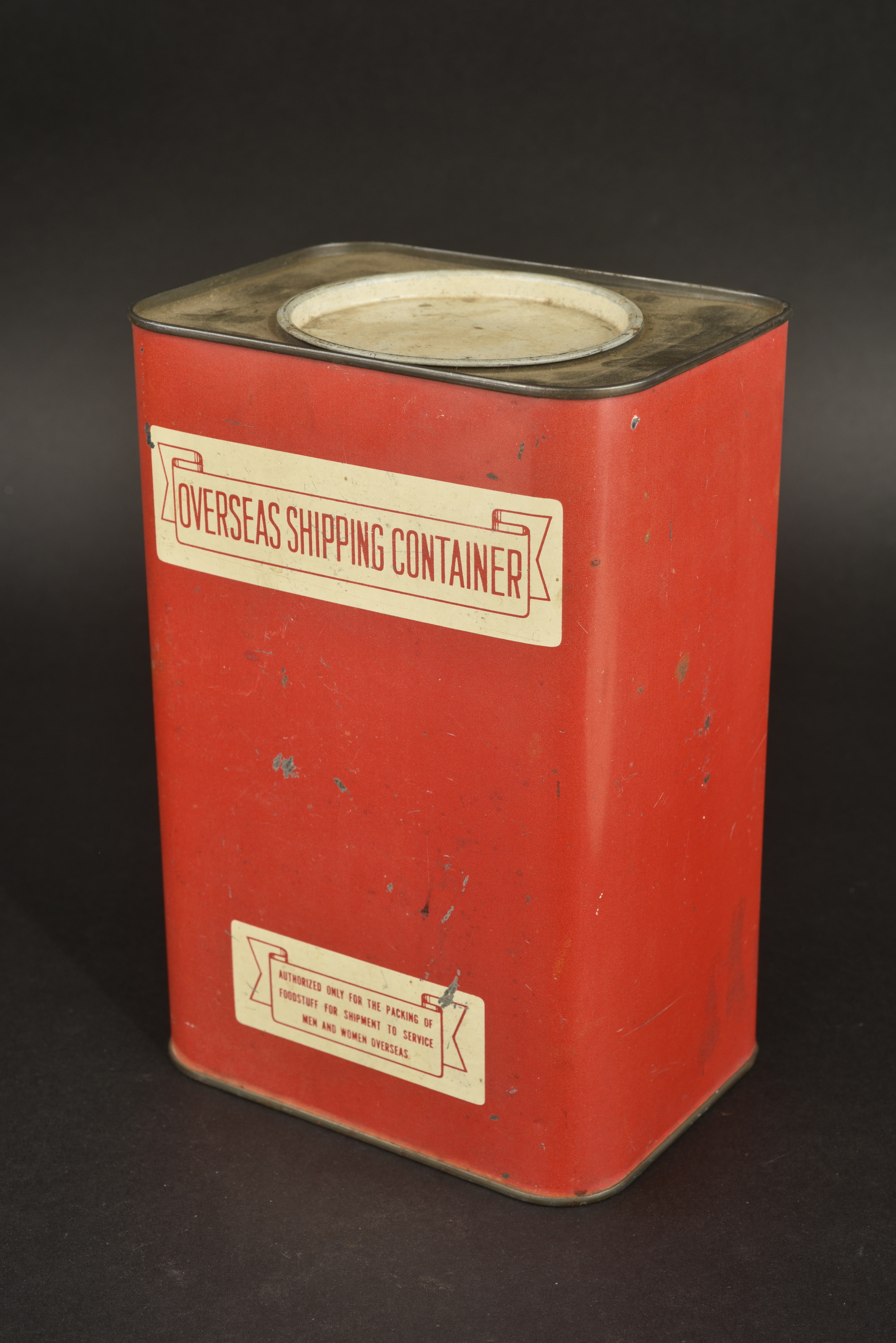Bidon en métal de couleur rouge, marqué Overseas Shipping Container, Authorized only for the packing of foodstuff for shipment to service men and women overseas. Couvercle présent. Sans date... en savoir plus