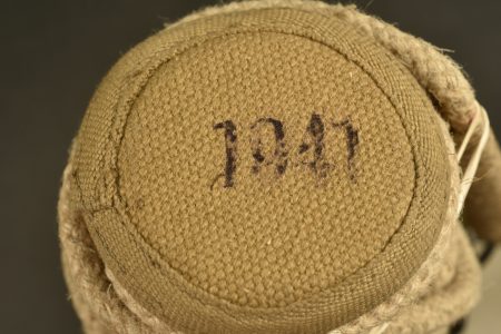 Fin corde enroulé sur une bobine en forte toile kaki rembourrée. Mousqueton présent. Modèle inconnu. Daté 1941. British Army WWII Dated 1941, kaki web bobbin reel, jute/hemp rope. Use Unknow.... en savoir plus