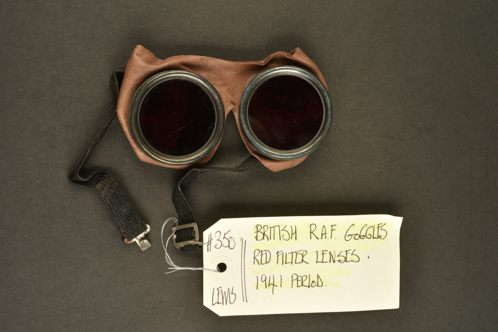 Armature en métal et fin cuir marron. Verres rouge, élastique en parfait état. Emballage d’origine ouvert, étiquette marquée 12/4082 Goggles Dark complète with red filters. Red filter... en savoir plus