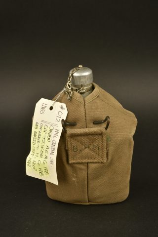 Housse en toile kaki, bien marquée US sur la face avant, marquages BM manuscrits sur plusieurs parties de la housse, attache complète, intérieur marqué NV 01407. Gourde en aluminium complète... en savoir plus