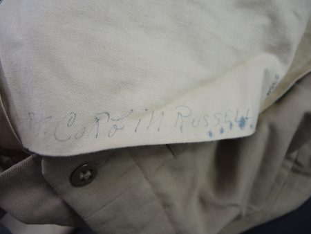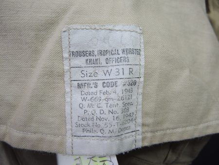 En tissu coton chino, tous les boutons sont présents, étiquette du fabricant MFR’s Code, datée du 4 févier 1943, taille W31R. Full label Feb 1943. A noter une légère usure et patine de... en savoir plus