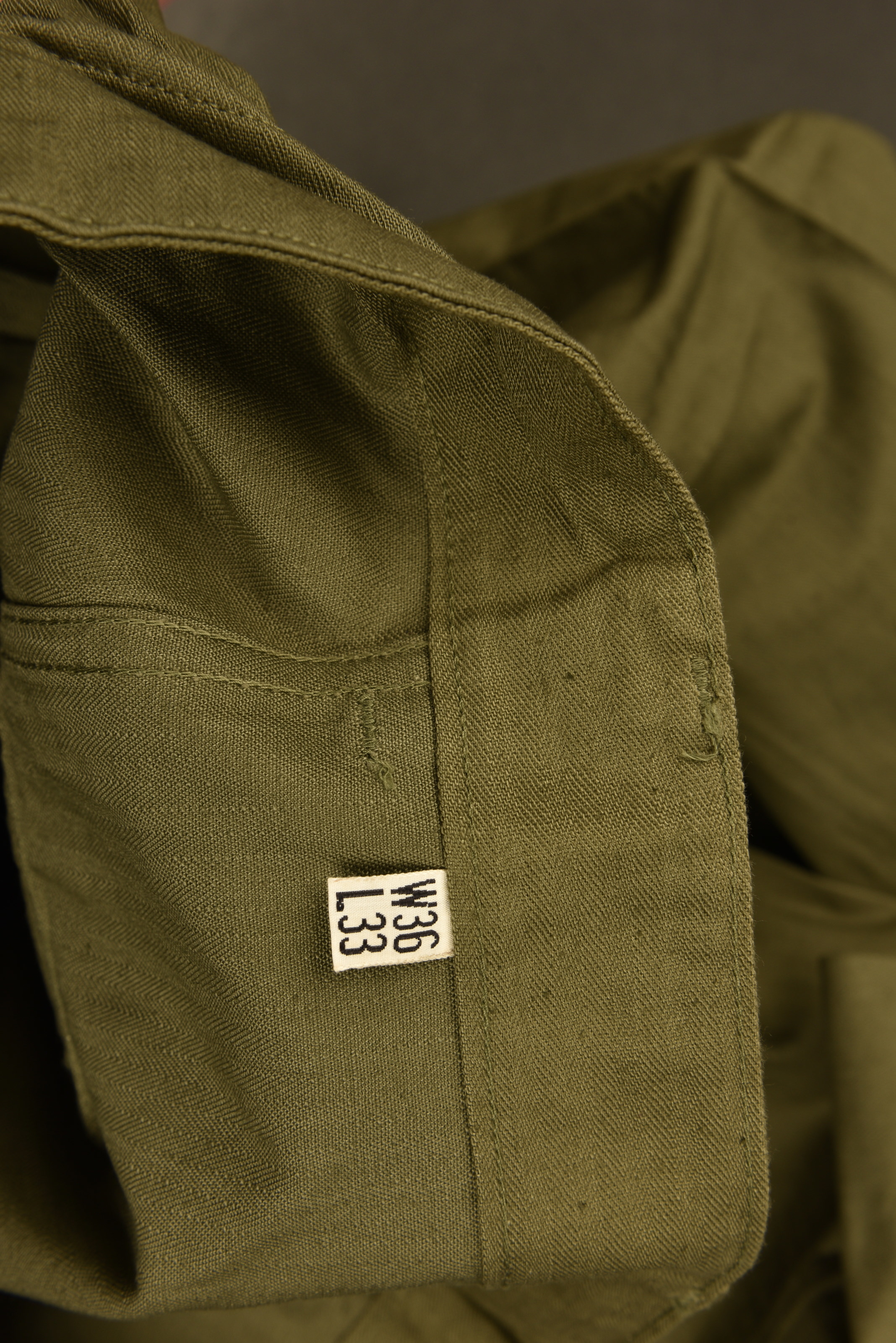 En toile HBT, tous les boutons sont présents. Pièce neuve de stock. Etiquette du fabricant Davenshire Inc, datée du 1 août 1944, taille 36 x 33. Les étiquettes de stock sont présentes sur... en savoir plus