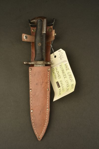 Couteau fabriqué à partir d’une baïonnette de Garand, lame raccourcie, fabrication Kutmaster UTICA NY USA fourreau en cuir marron, sans marquages visibles, crochet de fixation au... en savoir plus