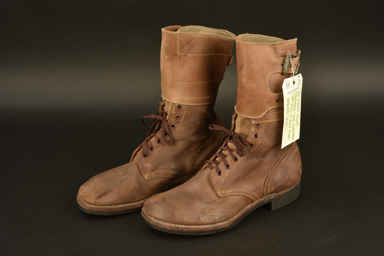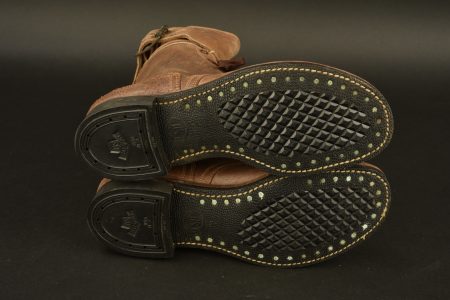 En cuir marron, sept œillets de laçage, les lacets sont présents, jambière attenante fermant par deux brides. Fabrication Gardiner Shoe Company, taille 10 1/2 correspondant à une pointure... en savoir plus
