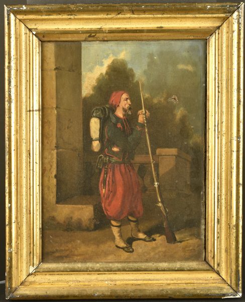 en tenue à l’orientale dans le style de la fin du second Empire en appui sur son fusil avec un paquetage complet. Hors cadre 24×32 cm. Encadrée, déchirure dans la toile.