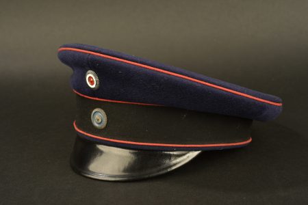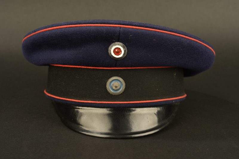 En drap bleu marine, bandeau noir, triple liseré rouge. Double cocarde. Intérieur doublé en tissu jaune. Bandeau de transpiration en cuir marron. A noter une certaine patine et usure de la... en savoir plus
