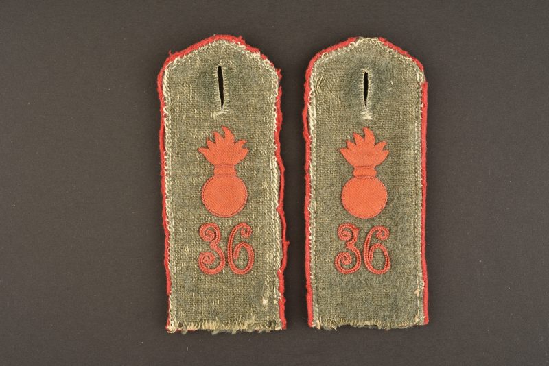 Patte d’épaule homogène, sur fond Feldgrau. Chiffre, liseré, et grenade de couleur rouge. Pièces démontés d’une vareuse. A noter une forte usure des pièces. Photos supplémentaires sur www.aiolfi.com. Additional photos on www.aiolfi.com.