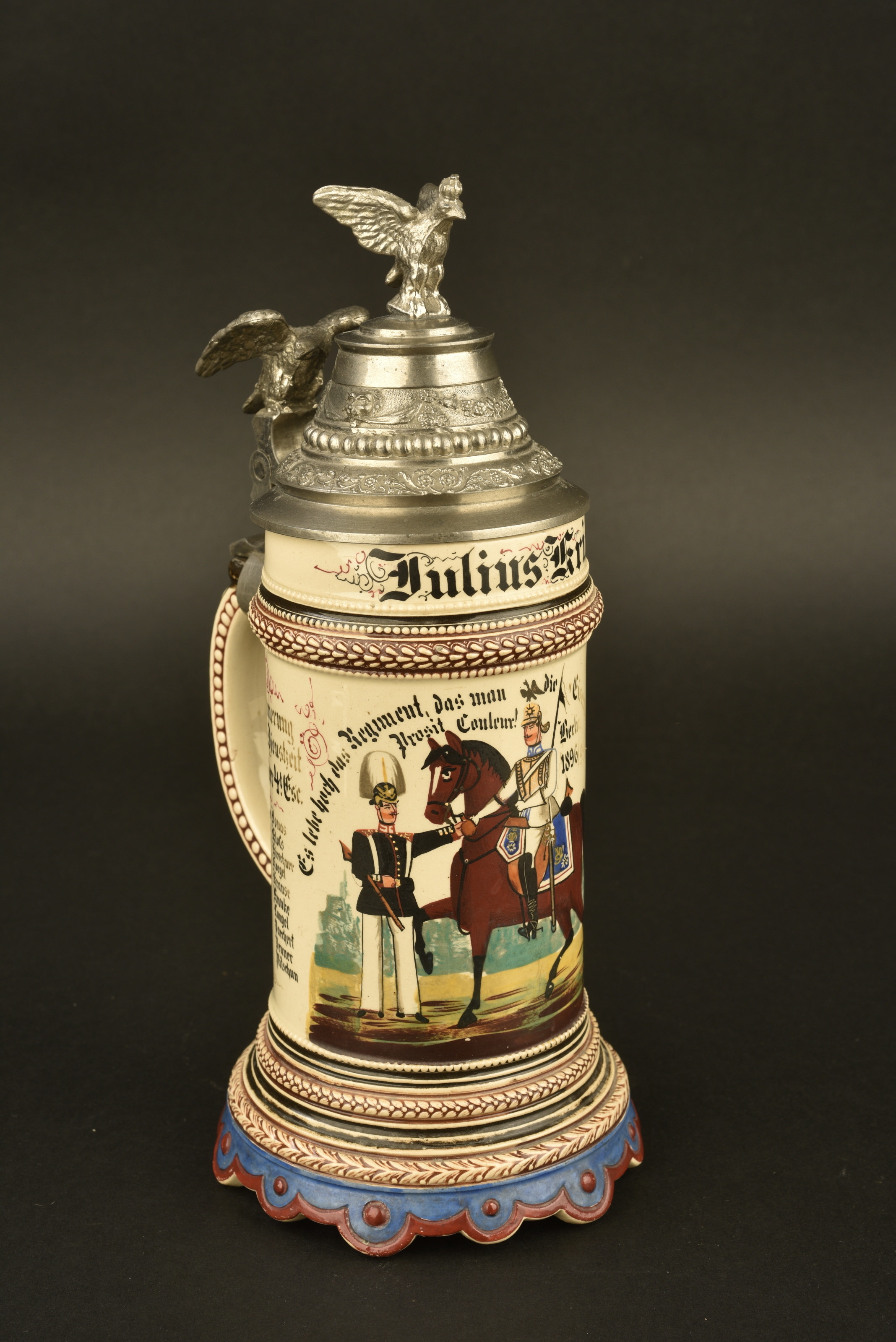 En grès au nom du soldat Julius Kritter. Très beau décors, partiellement effacé du côté droit. Couvercle complet surmonté d’un aigle couronné. Modèle d’1/2 litre. Fabrication... en savoir plus
