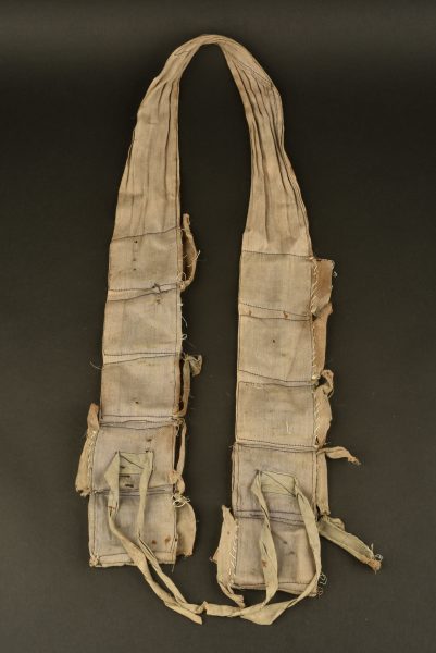 En toile écru, les lacets arrières sont présents. Rabats recousus, quelques uns sont manquants. A noter une forte usure de la pièce. Photos supplémentaires sur www.aiolfi.com. Additional... en savoir plus