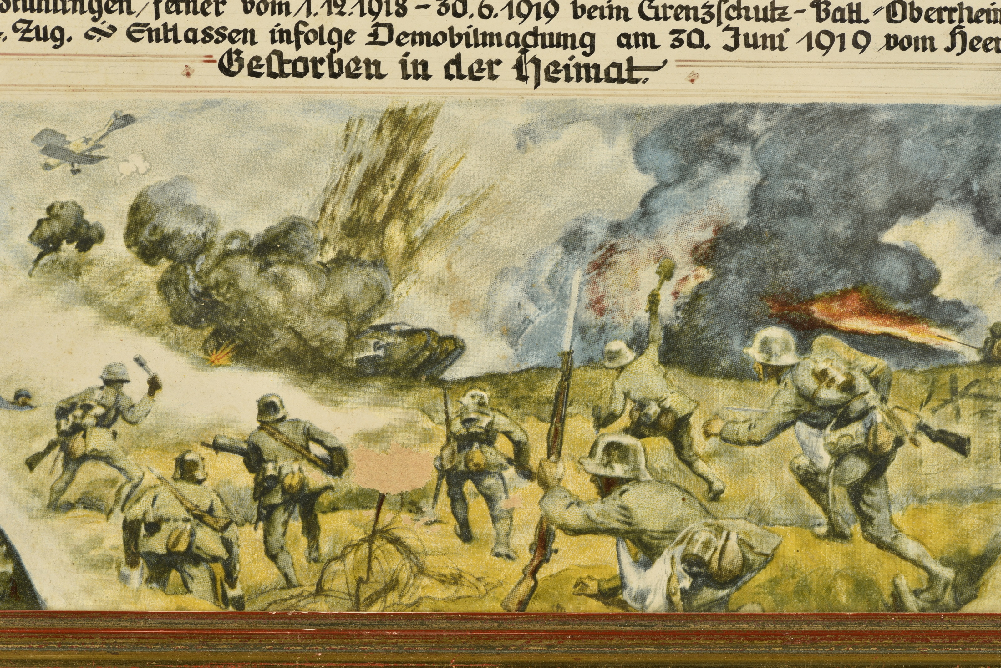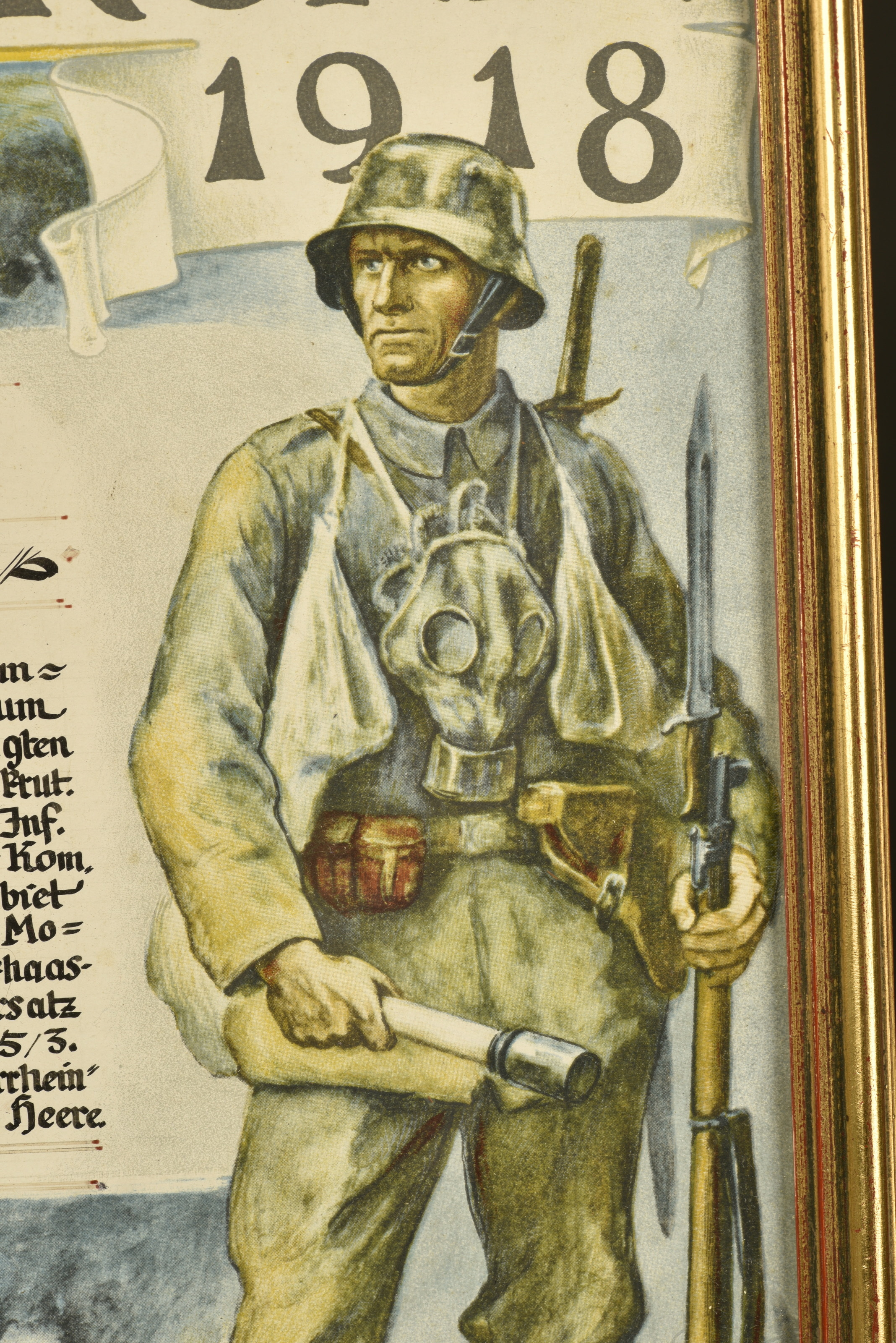 En couleur, texte en gothique. Attribué à Hermann Muntz du Garnison Komp 17 Antwerpen Belgien. Cadre doré de manufacture moderne. A noter une certaine patine de la pièce. Dimensions 33 X 45... en savoir plus