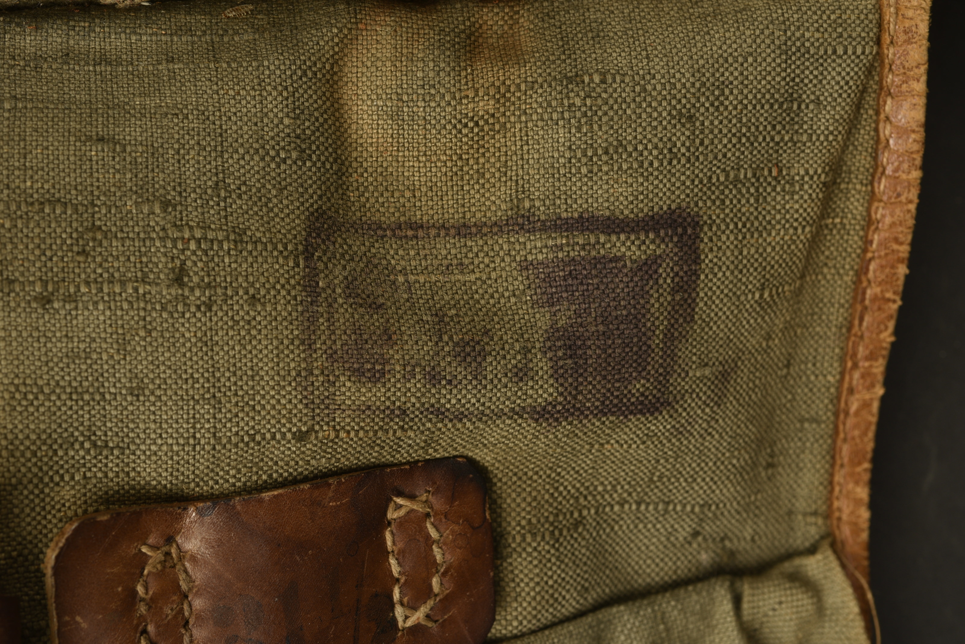 Sac en toile, les sangles en cuir sont présentes, arrière doublé de peau de vache, daté 1917. Contenant une gamelle et une toile de tente. A noter une certaine usure et patine des pièces.... en savoir plus
