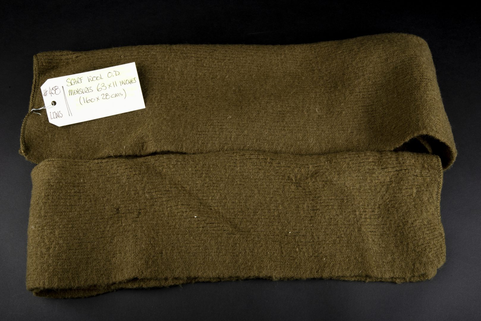 En drap kaki, sans marquages visibles, dimensions 160 X 28 cm. Measures 63 x 11 inches. A noter une certaine usure et patine de la pièce, ainsi que quelques trous de mite. C’est sans doute,... en savoir plus