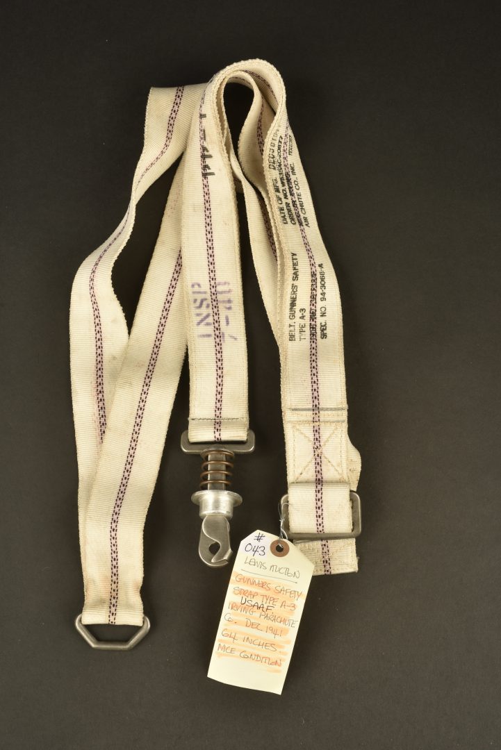 En forte toile blanche surpiquée de fil mauve. Fabrication Irving Air Chute Co Inc, datée du 30 décembre 1941. Mousqueton présent. Pièce en très bonne état. Irving Parachute Co Dec 1941, 64... en savoir plus