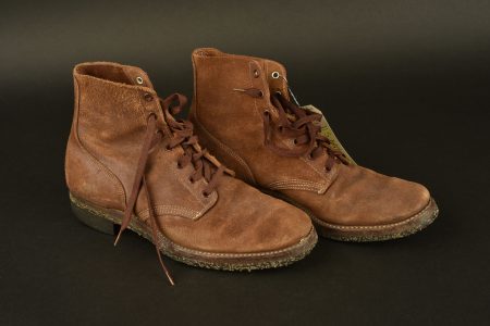 En cuir retourné, sept œillets de laçage, les lacets sont présents, semelles en cuir marquées Raw Cord, talon de fabrication Good Year. Marquages intérieurs USN , taille 9 1/2, fabrication... en savoir plus