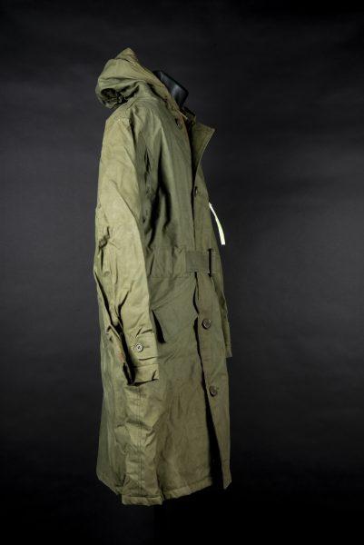 En toile imperméable kaki, tous les boutons sont présents, marquages USN sur la poche de poitrine. La ceinture est présente. Reste d’étiquette illisible dans le col. Intérieur doublé... en savoir plus