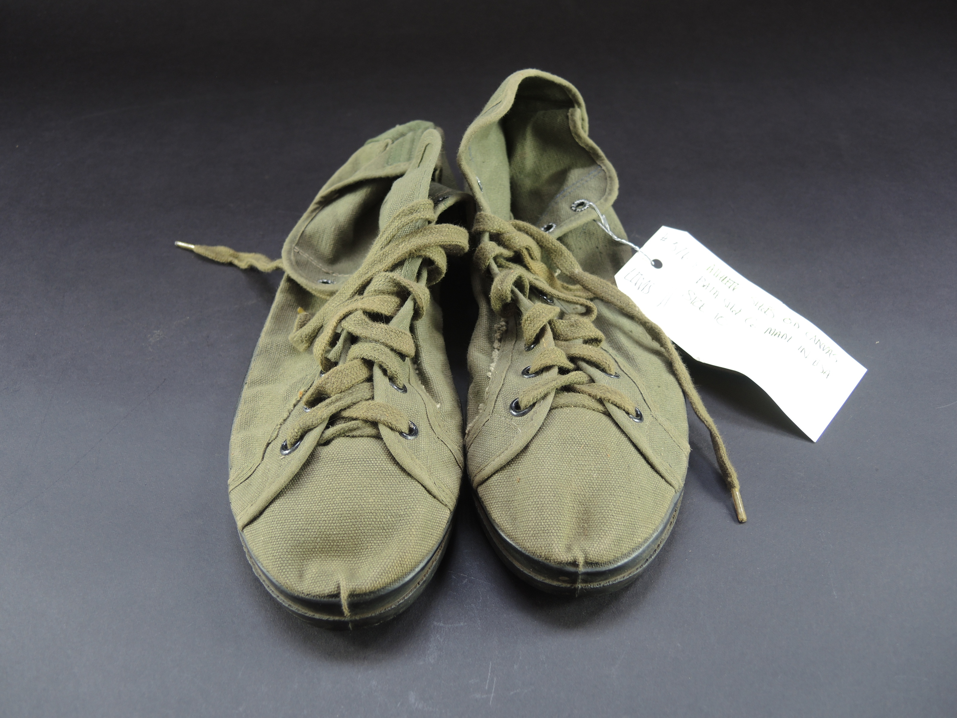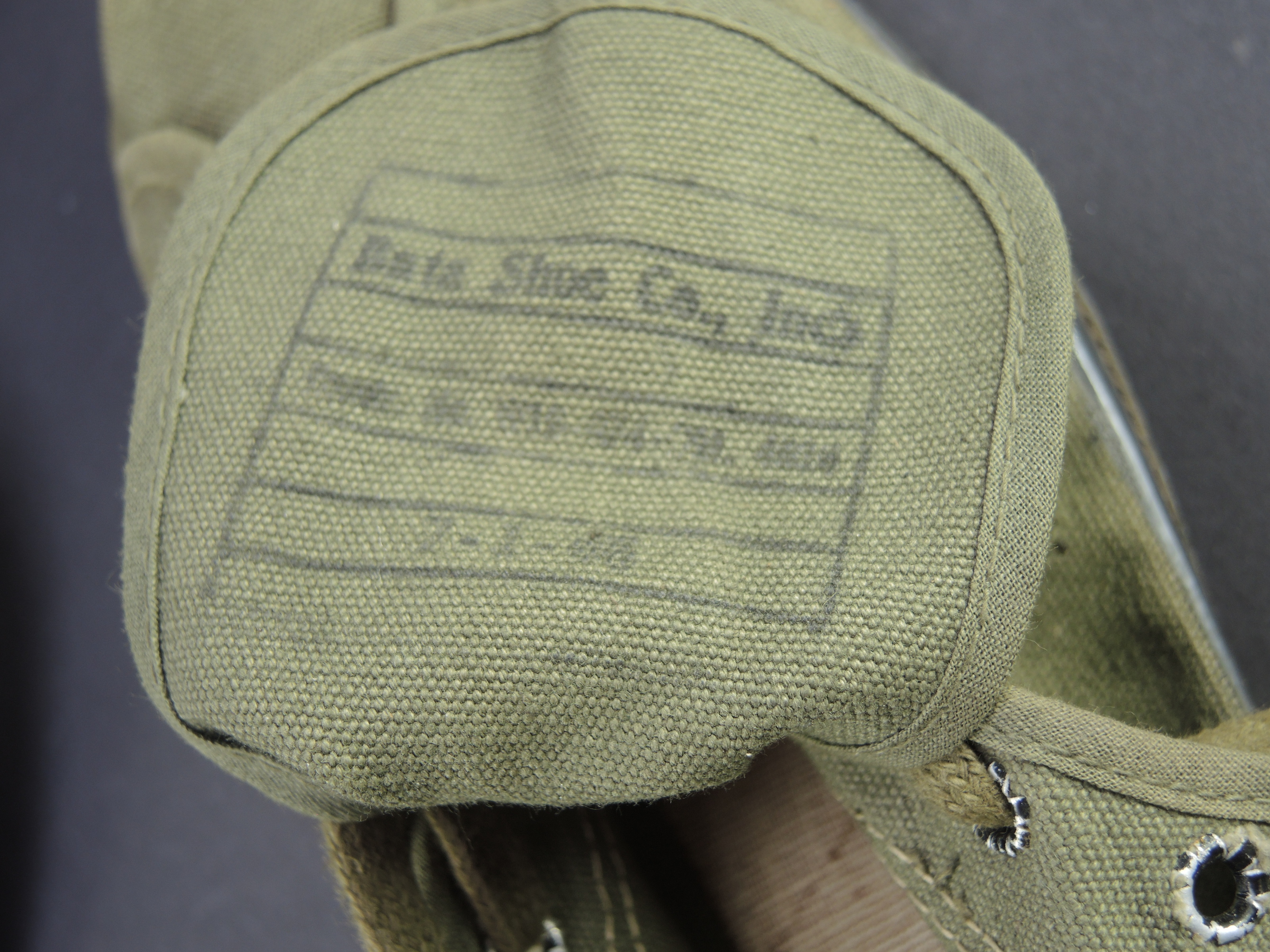En toile OD, huit œillets de laçage, les lacets sont présents. Semelles en caoutchouc. Fabrication Bata Shoe Co Inc, datée du 1er juillet 1944. Taille 10, correspondant à une pointure 44... en savoir plus