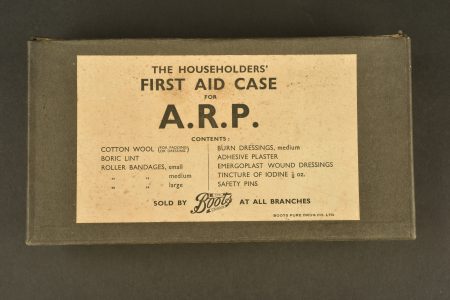 Boite en carton, étiquette marquée The Householder’s First Aid Case For ARP, fabrication Boots Pure Drug Co Ltd. Contenant de nombreux accessoires. Pièce présentant une légère usure et... en savoir plus