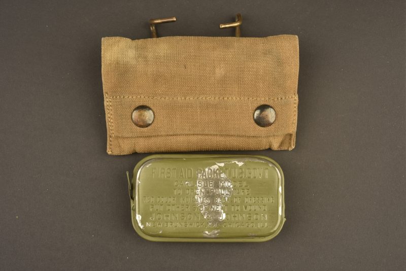 En forte toile kaki. Le crochet arrière est complet et en laiton. Marquages OMO 1918. Pansement présent dans son emballage en métal. A noter une légère usure de la pièce. Photos supplémentaires sur www.aiolfi.com. Additional photos on www.aiolfi.com.